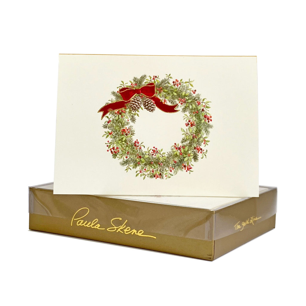 Foil stamped & embossed Pine Cone and Berry Wreath holiday greeting card.